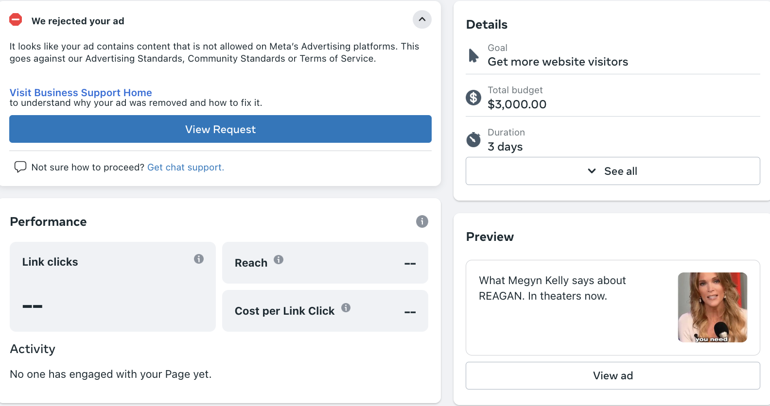 Facebook did not say why posts that were not paid ads were problematic, nor did it address the temporary suspension of the Reagan page. Facebook also did not respond to this reporter’s request to explain why the more recent posts and ads were also removed or rejected.