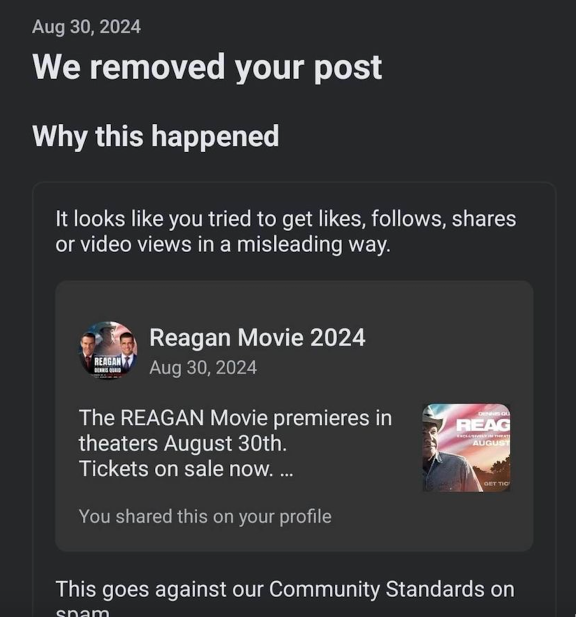 Another recent incident involved Facebook apparently removing a post from a fan announcing: “The REAGAN Movie premieres in theaters August 30th. Tickets on sale now.”